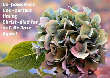 That is Easter summed up. We are powerless, God’s perfect timing, Christ died. But wait there is one more thing: He rose again!